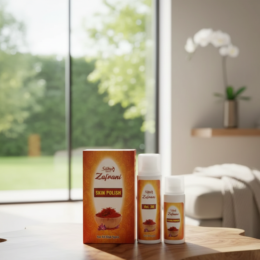 The Silky Zafrani Skin Polisher Pack (120ml Polisher + 60g Activator) is designed for all skin types to deliver effective exfoliation and radiance boosting. This two‑step formula gently removes dead skin cells, enhances skin texture, and restores a natural glow.